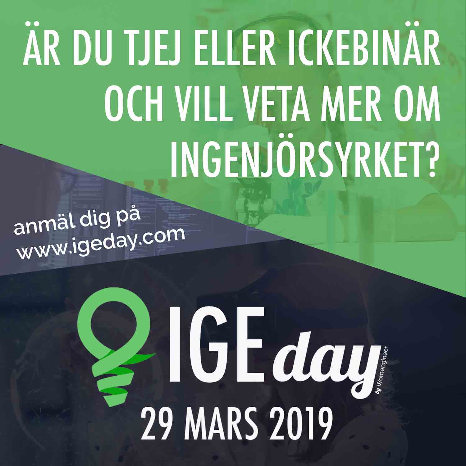 IGEDay står för Introduce a Girl to Engineering-day och är en dag som arrangeras av Womengineer tillsammans med ett gäng olika företag. Dagen är till för att tjejer och icke-binära 13- till 19-åringar ska få besöka företag för att lära sig om teknik och ingenjörsyrken.